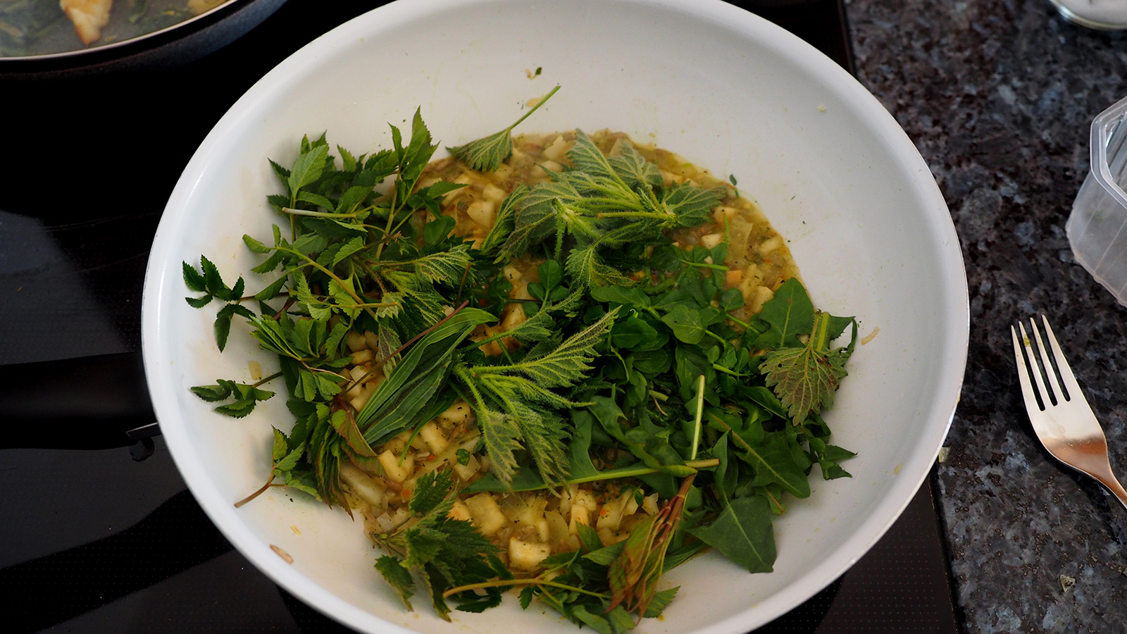 - Wildkräuter (Bachkresse, Brennenesseln, Giersch, Löwenzahn, Schafgarbe, Spitzwegerich und Vogelmiere)